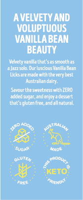 Our luscious Vanilla Bean LICKS are made with the very best in Australian Dairy. Savour the sweetness with ZERO added sugar, and enjoy a dessert that’s gluten-free, and all natural.